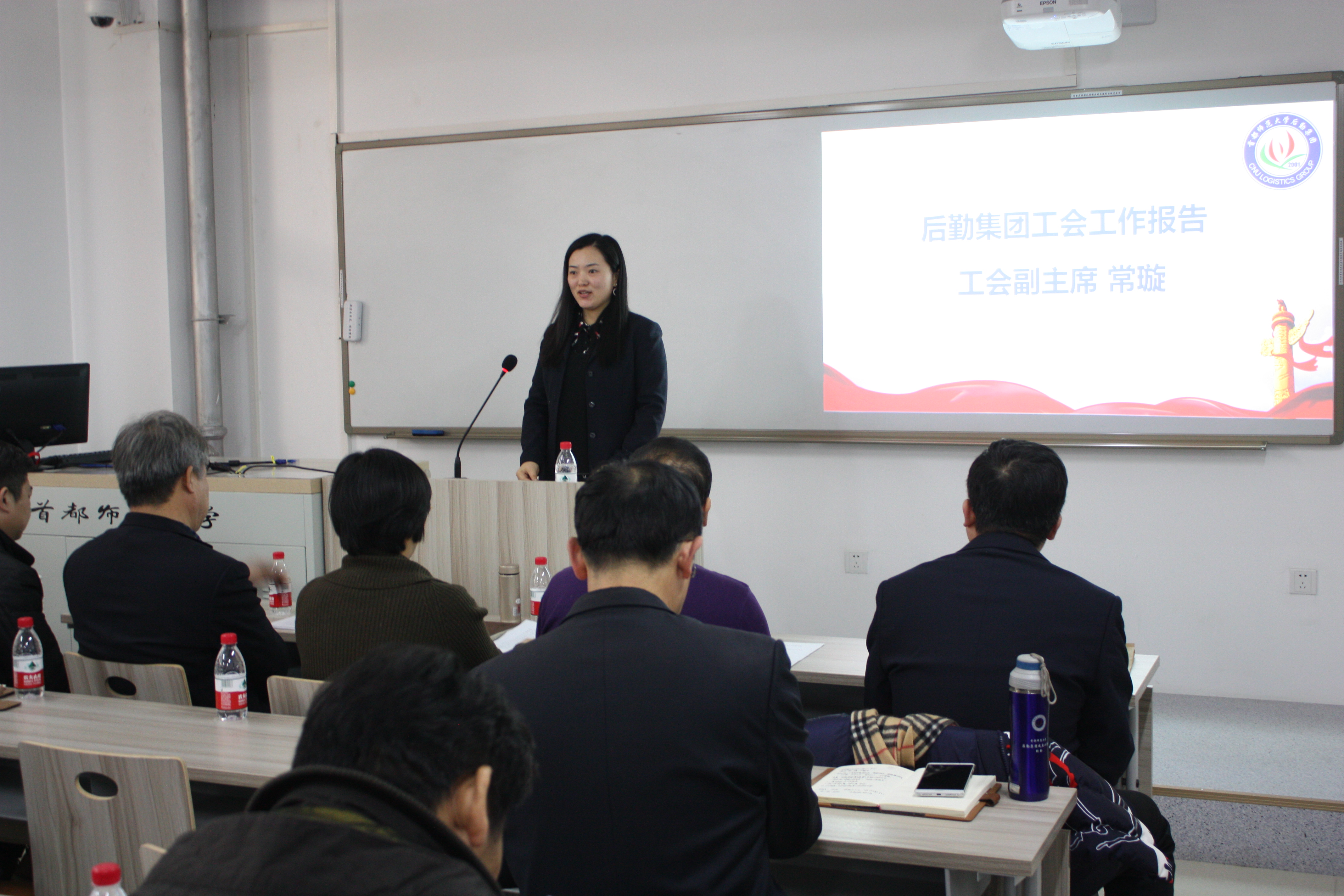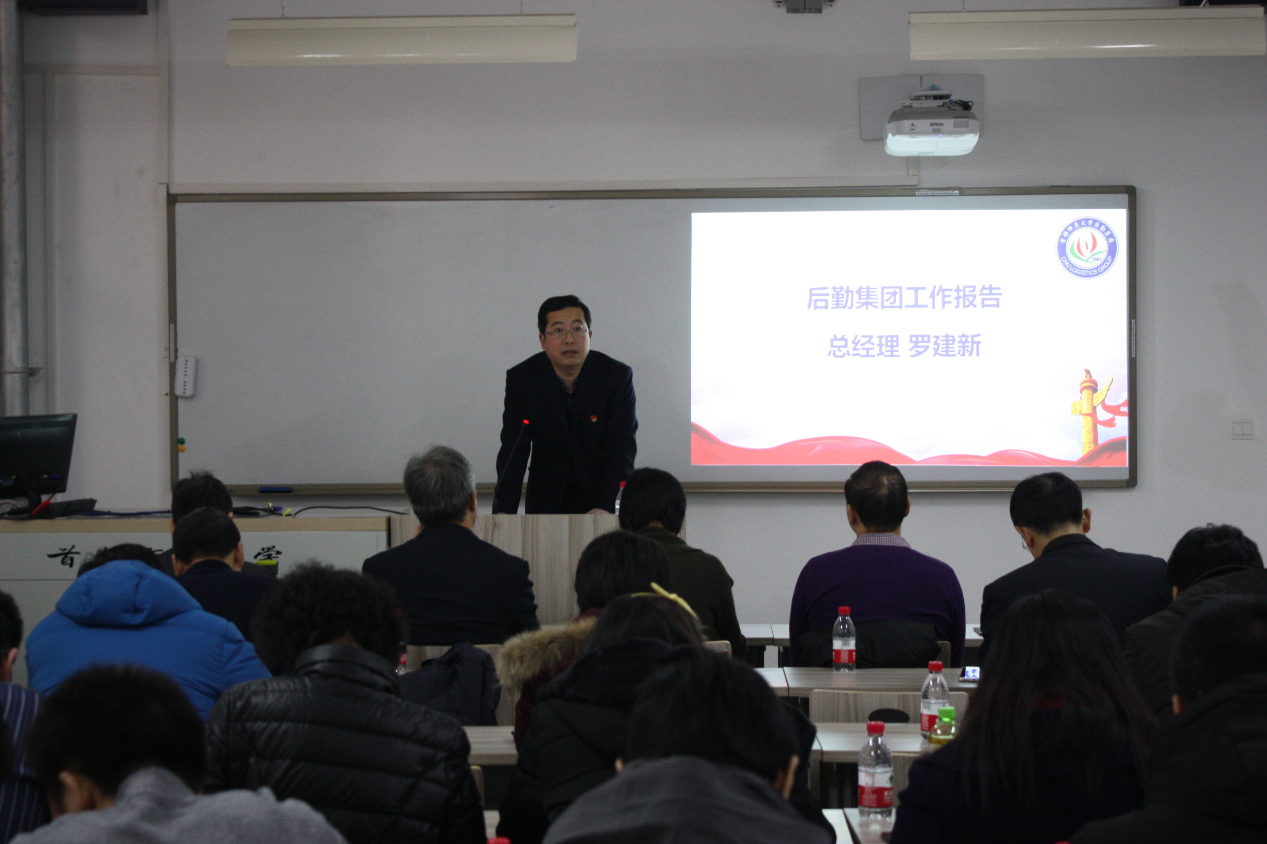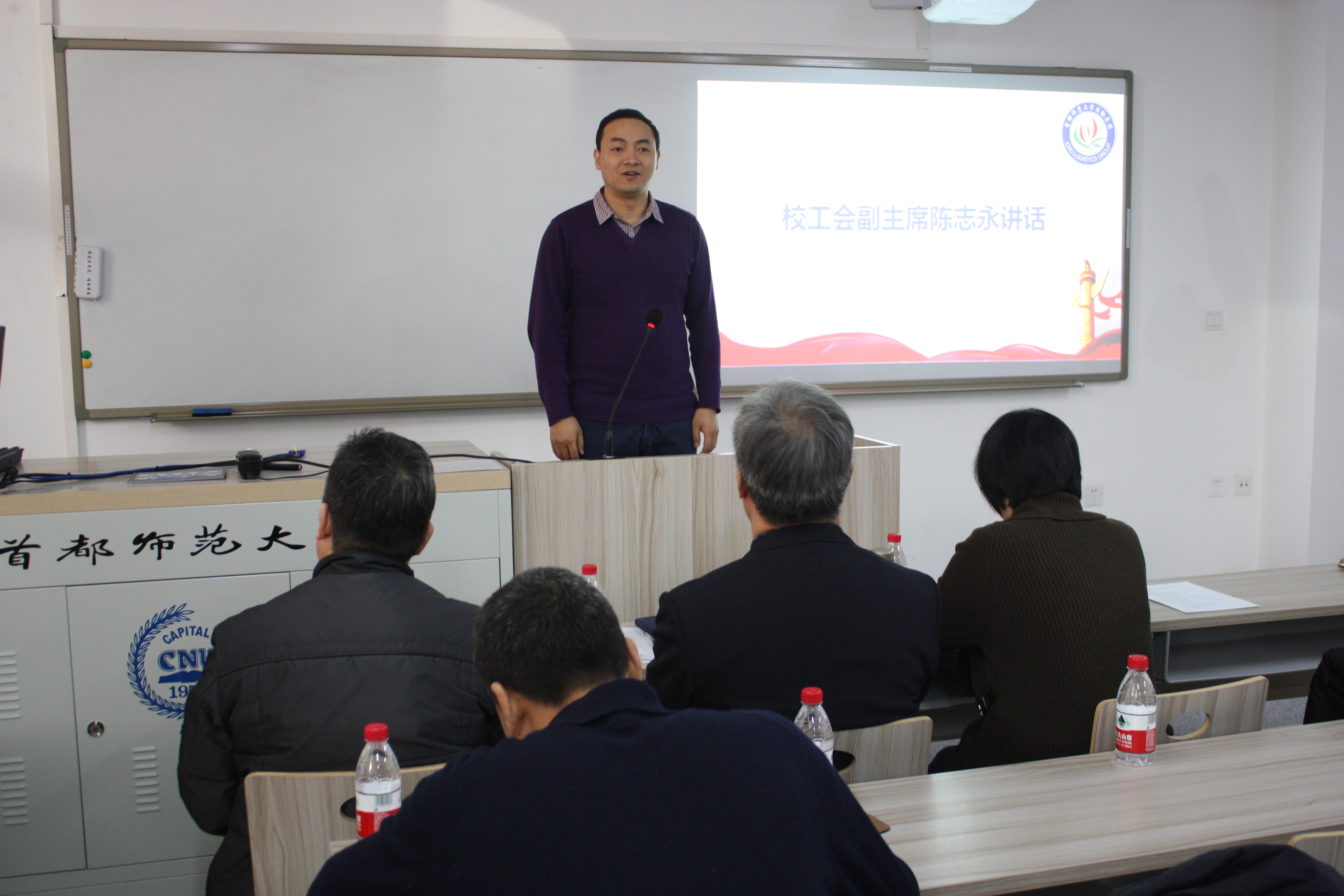 校工会副主席陈志永讲话。他肯定了后勤集团在2017年取得的成绩,介绍了学校工会2017年的主要工作,2018年学校工会将继续支持集团开展职工岗位技能大赛等各项活动,切实关注和保障职工权益。